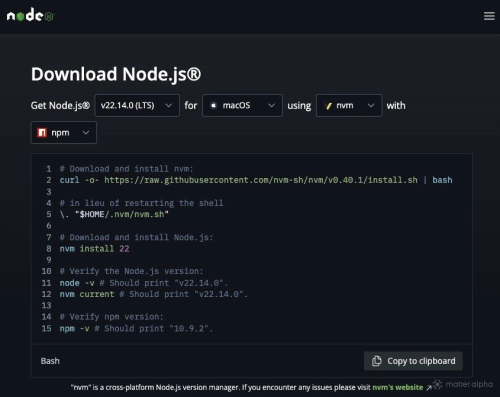 Start by ensuring you have the latest version of Node installed; Matter.js needs at least v22. The easiest way to do is to visit Nodejs.org, and run the download script provided (just copy and paste the whole thing in your terminal):