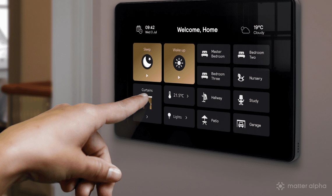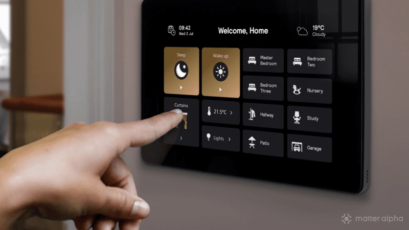 Combining the Philips Dynalite Touchscreen (PDTS) with the Philips Ethernet Gateway, the new Philips Dynalite Matter Bridge is a wall-mounted, powered device providing remote control of smart home devices via apps and smart assistants.