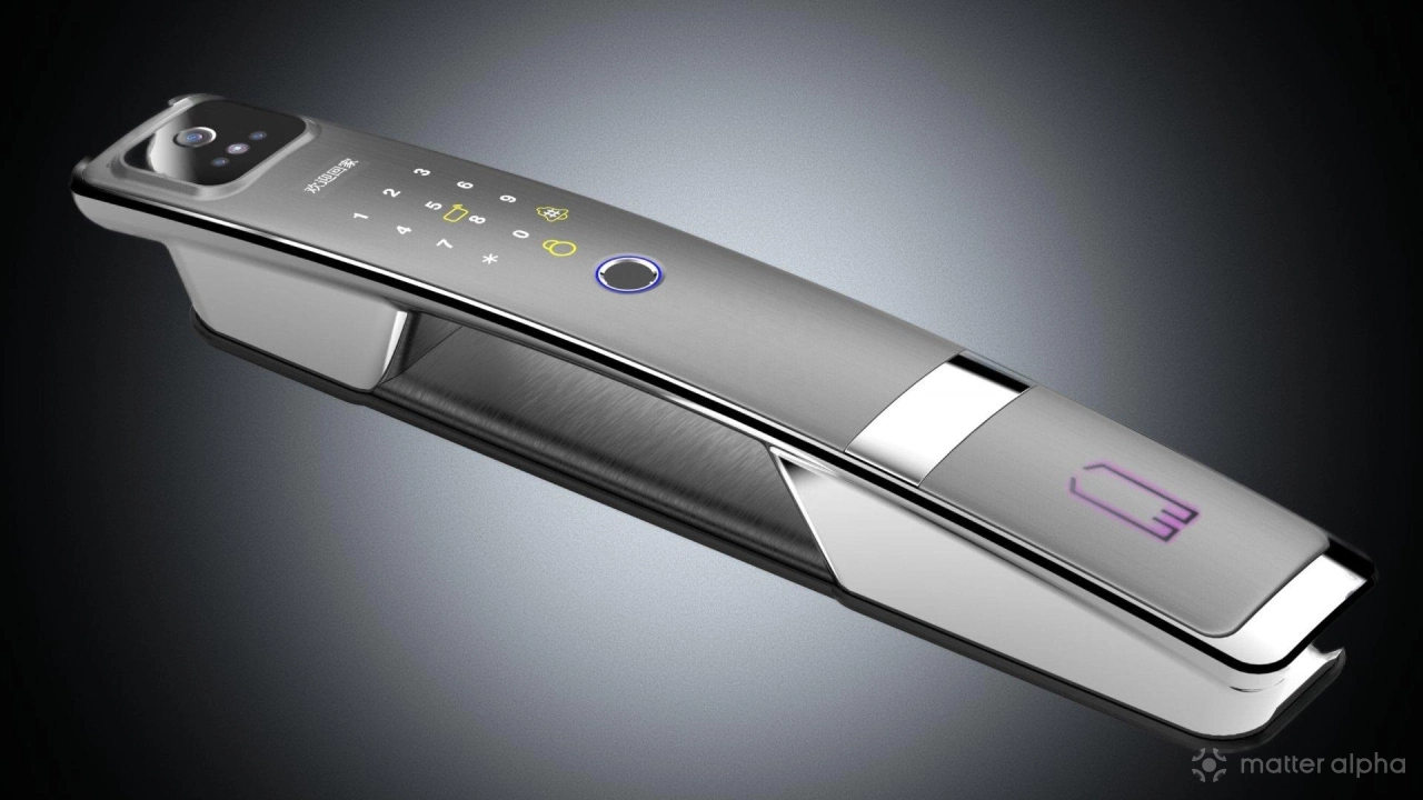 The outer portion of the lock is home to a small camera and face recognition components near the top, a tiny LCD presumably for personalizing greetings, a keypad with an NFC card reader underneath (cards are included with purchase), a fingerprint scanner, an emergency keyhole, and a USB port. Specifications for the lock list that up to 50 fingerprints and 50 key codes can be stored, and its onboard camera can recognize hand and palm gestures for effortless home access.