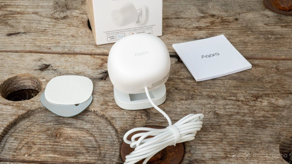 Inside the FP1E box, you’ll find the sensor with a 2-meter hardwired USB power cable, a magnetic mounting plate, and the instruction manual (complete with Aqara pairing code).