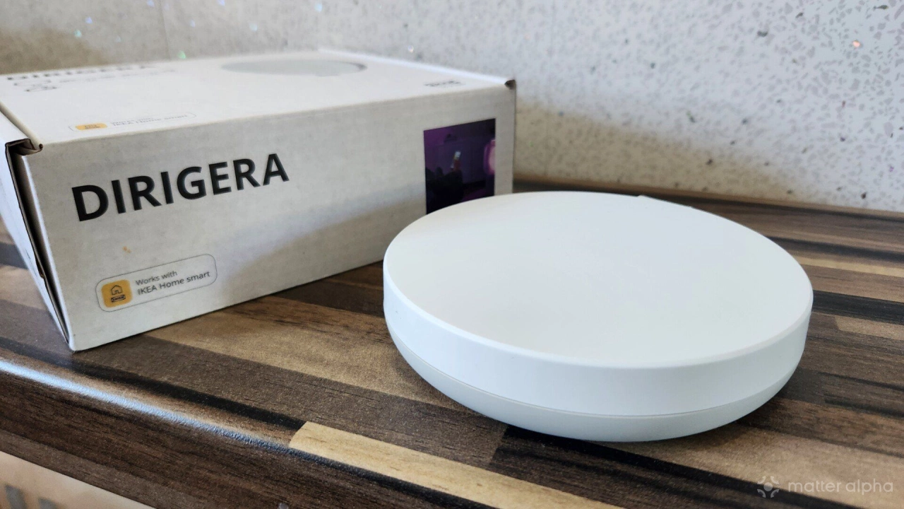 Measuring 4 3/8” (diameter) by 1 1/8”, the DIRIGERA can be positioned pretty much anywhere. For use as a Matter bridge, however, it needs a physical connection to your router.